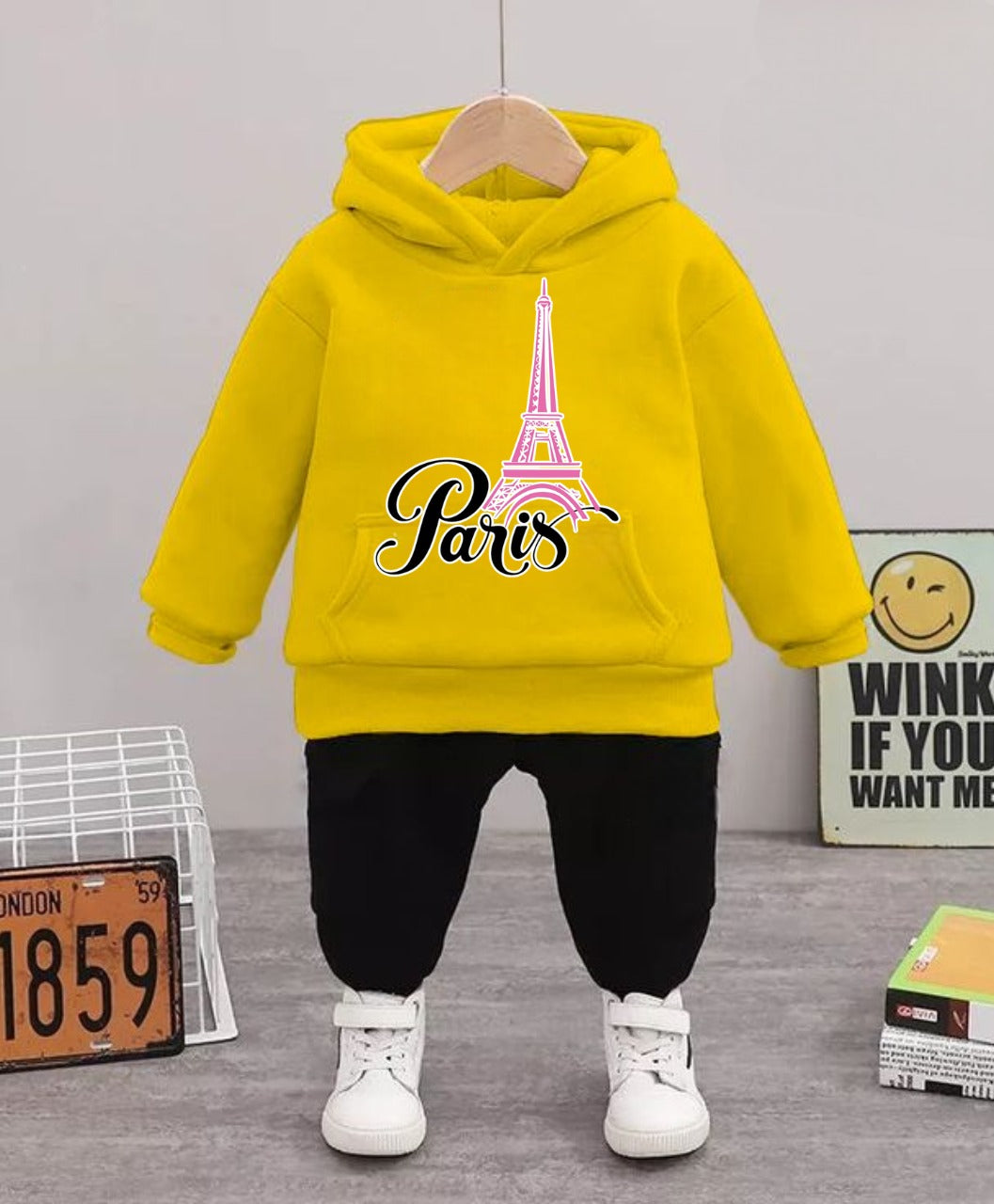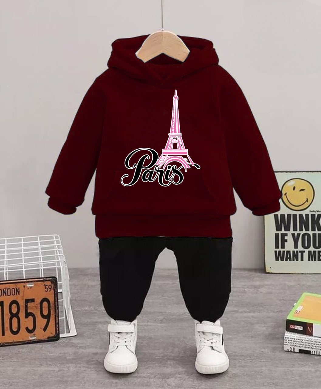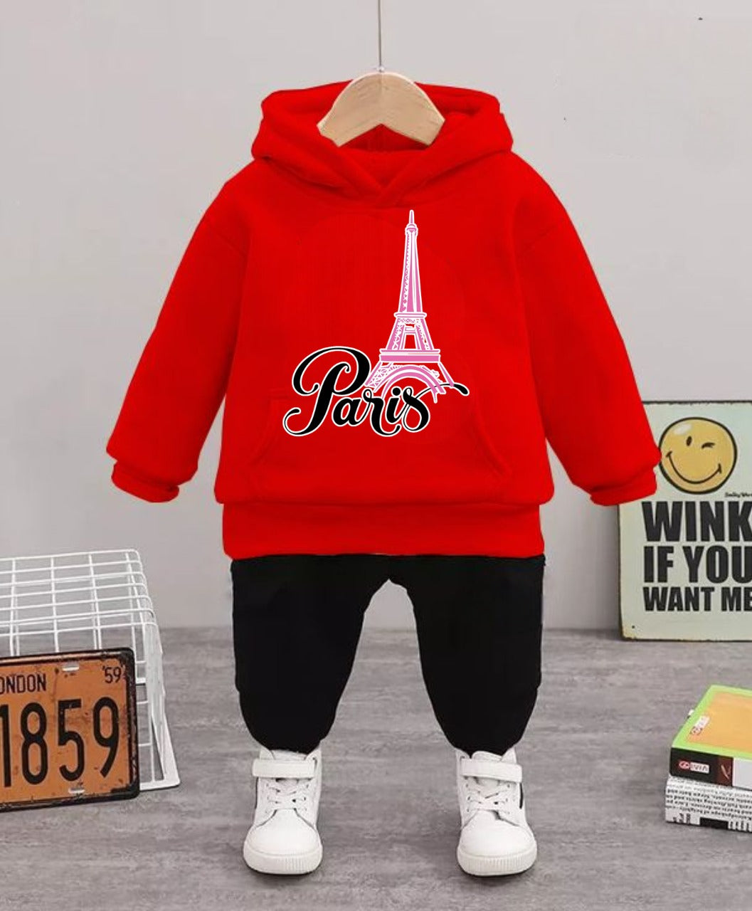 Ek stylish laal hoodie jismein Paris ka mash-hoor Eiffel Tower bana hua hai, saath mein "Paris" ka elegant text. Yeh set un choti bachiyon ke liye hai jo fashion aur travel-inspired prints pasand karti hain.
