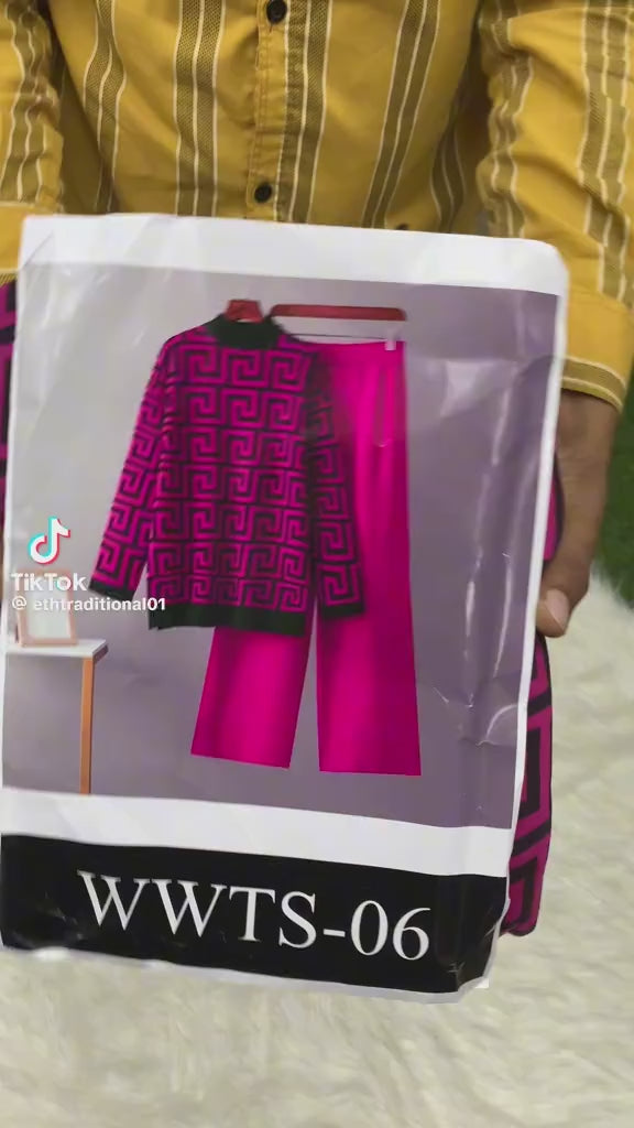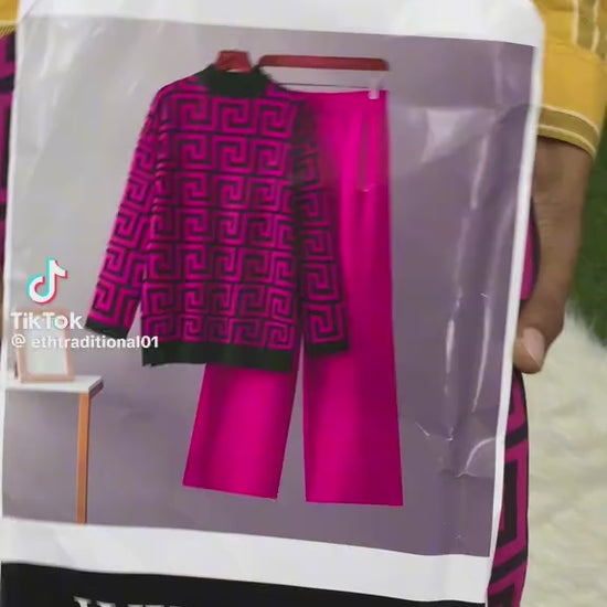 A stylish two-piece women's outfit featuring a long-sleeve, high-neck sweater and coordinating wide-leg trousers. The oversized sweater is adorned with a bold, repeating geometric maze or labyrinth pattern that creates a striking visual contrast. The pattern is contained within the hem, cuffs, and neckline. The relaxed-fit trousers complement the top, creating a comfortable yet sophisticated silhouette. This modern ensemble is suitable for casual outings, work, or comfortable travel.