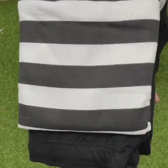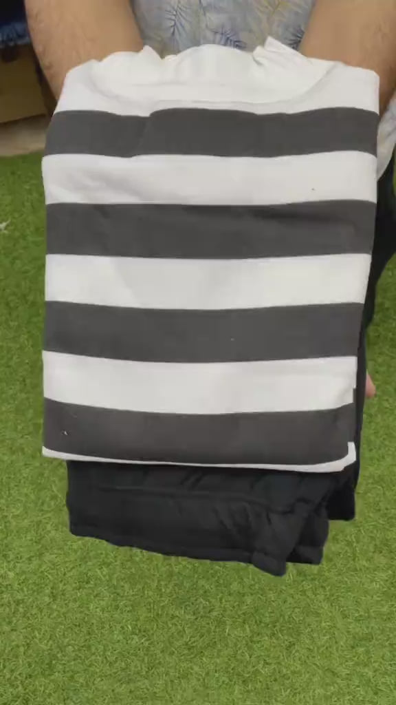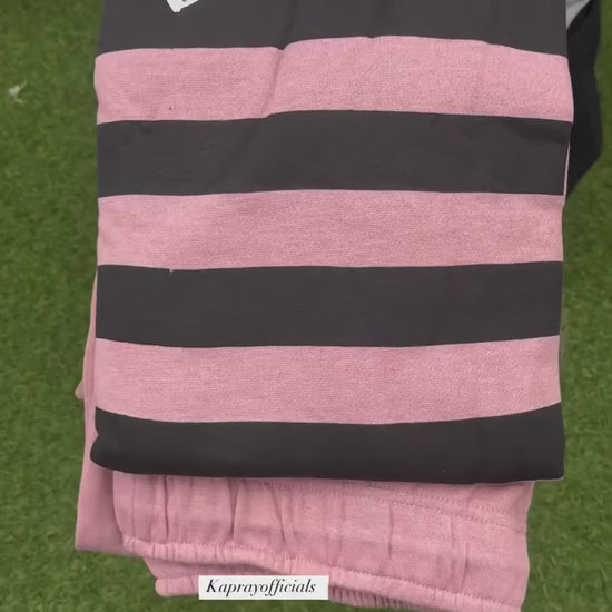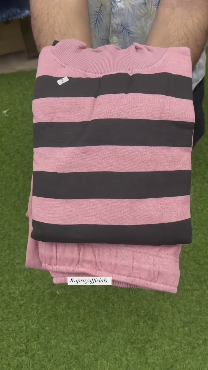 Sardiyon ke liye ek shandaar aur elegant outfit. Is set mein ek lambi high-neck tunic hai jiska bold stripe pattern bahut classy lagta hai. Iske sath matching wide-leg pants hain. Iska soft aur garam knit fabric aapko thand se bachayega aur ek modern look dega.