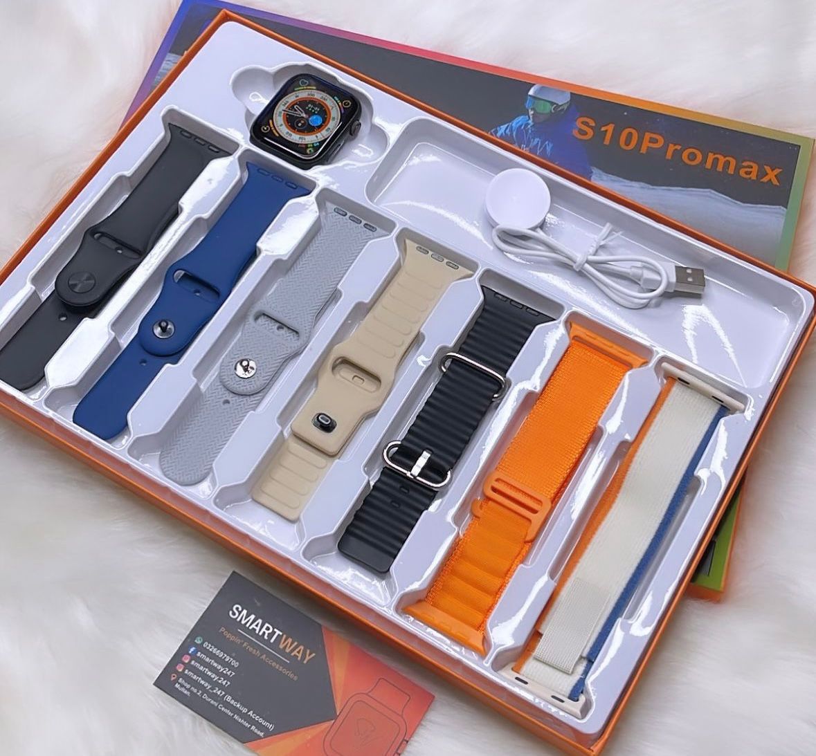 Discover the feature-packed S10 Pro Max Series 9 Smart Watch, designed to keep you connected and on top of your health. This premium smartwatch comes with a durable metallic case and a versatile 7+1 accessory set, including the watch unit, charger, and seven interchangeable straps in various colors (black, blue, grey, beige, black, orange, yellow/black woven) to match any outfit or occasion. Enjoy comprehensive health monitoring features such as heart rate tracking, blood pressure measurement, step counting, and sleep analysis. Additional functions include weather updates, calendar, and more, making it an essential companion for your daily life.
